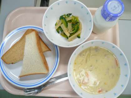 献立 二色サンド(ジャム・チーズ) コーンクリームスープ 大根ときゅうりのじゃこサラダ 1年生はサラダなし 清美オレンジ 牛乳