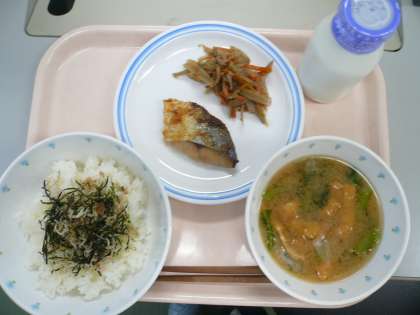 献立 ごはん じゃこふりかけ みそ汁 鰆のみそ焼き 五目金平 牛乳