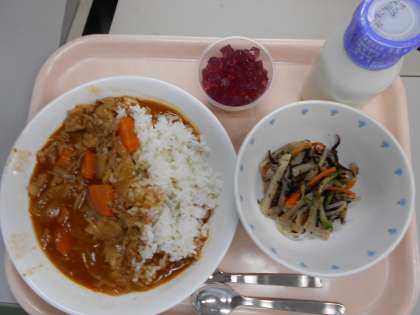 献立 ハヤシライス ひじきと大根のサラダ あじさいゼリー 牛乳