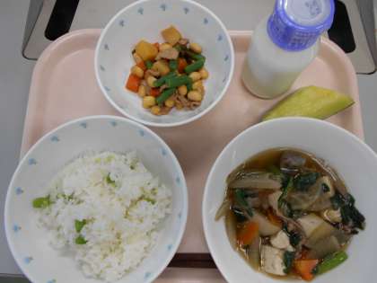 献立 枝豆ご飯 けんちん汁 変わり大豆 メロン 牛乳