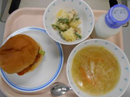 献立エビチリバーガー ジュリエンヌスープ ポテトのポットベーコンサラダ 牛乳