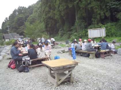 自分たちで釣って、さばいて、焼いた魚でお弁当を食べています。