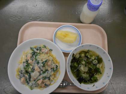 献立 鮭とほうれん草のクリームスパゲティ 青梗菜とわかめのスープ りんご 牛乳