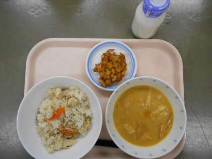 献立 豆腐めし 呉汁 一口ちりめんじゃこ揚げ 牛乳