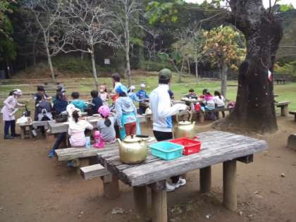 昼食の時間です。苦労して、協力して作った味は、格別です。