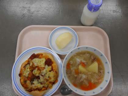 献立 手作りピザ 野菜のスープ りんご 牛乳