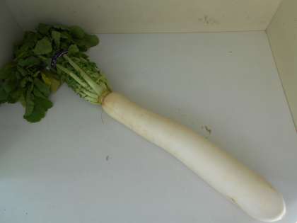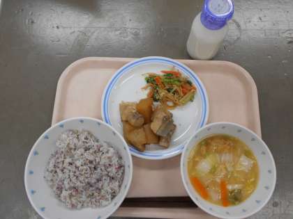 今日は19日食育の日です。東京都八王子市でとれた大蔵大根を使ってぶり大根にしました。大蔵大根を給食の時間に持っていくと「根っこが太い。」「大きい。」といろいろ発見していました。