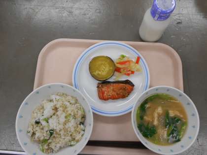 献立 じゃこ菜飯 みそ汁 鮭の香味焼き さつま芋の甘煮 一塩野菜 牛乳