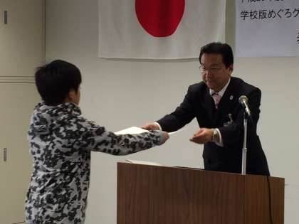 グリーンアクションプログラム表彰式(1) 公開日 2015/03/09 更新日 2015/03/09 共通 このたび、宮前小学校は学校版めぐろグリーンアクションプログラムで優良校として選ばれました。 先週の金曜日、区役所で行われた表彰式に、環境美化委員会の6年生が代表児童として参加しました。まず、立派な表彰状と副賞をいただきました。 いいね(0)