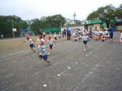 2年生と3年生が、陸上部の学生さんにかけっこ教室で上手な走り方を教わっています。