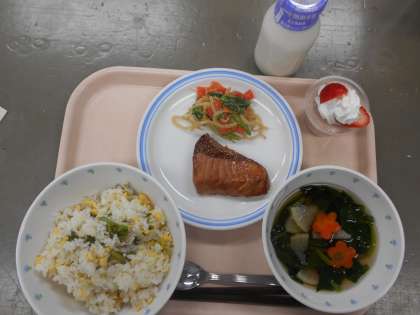 献立 菜の花寿司 すまし汁 鰤の照り焼き 胡麻和え 苺のムース 牛乳