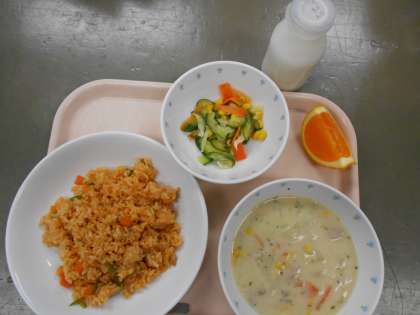 献立 チキンライス 豆乳のコーンシチュー 茹で野菜のドレッシングソース ネーブル