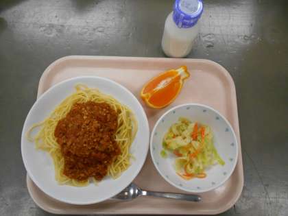 献立 スパゲティビーンズミートソース 茹でキャベツと人参のドレッシングソース デコポン 牛乳