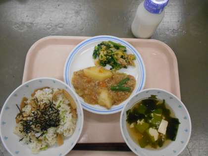献立 たけのこごはん すまし汁 新じゃがのそぼろ煮 胡麻和え 牛乳