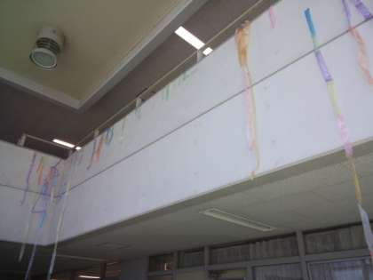 図工室の前の廊下から、スズランテープをつなげてみました。きれいですね!
