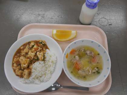 献立 ごはん 麻婆豆腐 鶏肉とはるさめのスープ 美生柑 牛乳