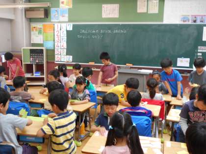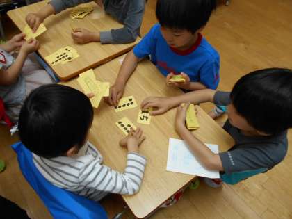 1,2年生は、今週末に学校探検をします。一緒に回る1年生・2年生が顔合わせをしました。2年生から数字カードセットをプレゼントしてそのカードを使って一緒に遊びました。顔と名前をしっかり覚えて仲よくなることができました。学校探検が楽しみです。