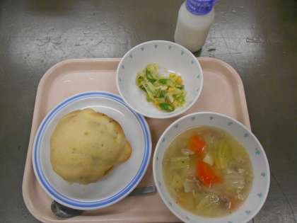 献立 ビスキューイパン 野菜たっぷりスープ 三色サラダ 牛乳