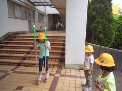 雨もあがり初夏のような日差しの中、子供たちは元気よく遊んでいます。竹馬も上手です。