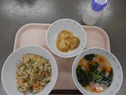 献立 豚肉と昆布のまぜごはん 大根スープ 草餅 牛乳