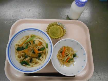 献立 五目うどん 野菜のごまじょうゆがけ 抹茶ケーキ 牛乳