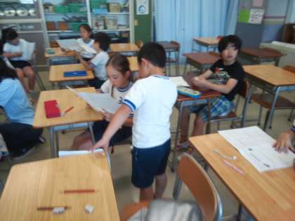 3年生が少人数の学習でわり算の問題を作り、友達と確認しています。