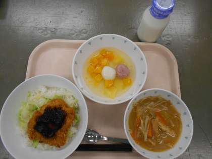 献立 味噌かつ丼 みそ汁 フルーツ白玉 牛乳