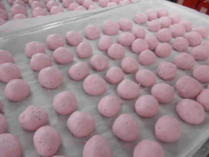 フルーツ白玉は、大玉をイメージして、白玉といちごピューレをいれた赤玉を作りました。見た目もかわいいデザートになりました。