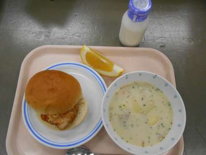 献立 チーズバーガー 大豆入り豆乳スープ 美生柑 牛乳