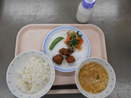 献立 ごはん みそ汁 鰹の甘辛揚げ にらあえ スナップエンドウ 牛乳