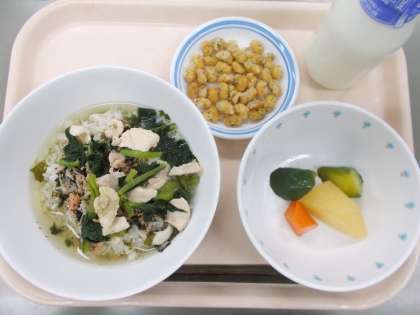 献立 スープ茶漬け 中華風野菜 のり塩大豆 牛乳
