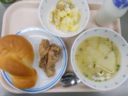 献立 ミルクパン 冬瓜のスープ ウィングのマーマレード煮 コーンポテト 牛乳