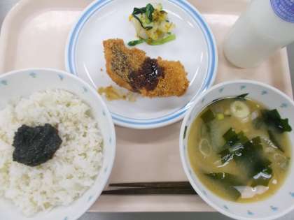 献立 ごはん のりの佃煮 みそ汁 魚のフライ おひたし 牛乳