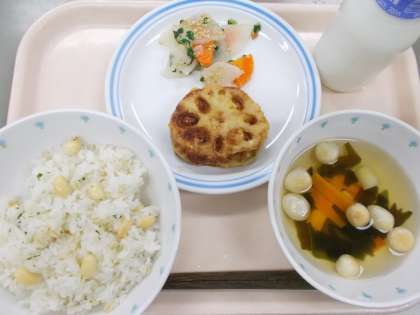 献立 大豆ごはん すまし汁 れんこんのはさみ揚げ 野菜の梅和え 牛乳