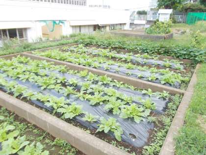 野菜の梅和えは、近隣の畑に2年生が青首大根の種を植えに行き、その大根の間引きを農家の方がしてくれたものを使いました。青首大根は順調に生長しています。