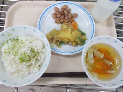 今日の献立は、あおのりごはん、さわに椀、肉じゃが、煮豆、牛乳です。