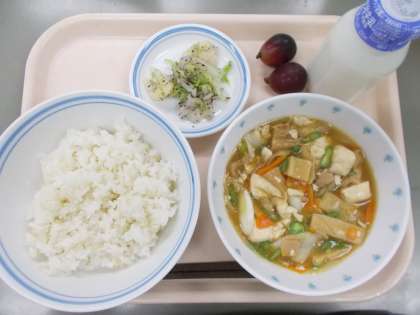 今日は、肉豆腐に車麩をい入れました。「お麩苦手だけど、これは食べられた。」と感想がありました。献立表では果物早生みかんでしたが納品の関係上、巨峰に変更になりました。先週金曜日に牛乳保冷庫の故障でご迷惑をおかけしました。お昼に牛乳の納品業者が配達をしてくれ、通常通り提供ができたことに安堵しました。保冷庫の修理も無事終わりました。保護者の皆様ご協力ありがとうございました。