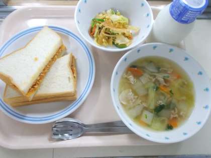 献立 ミートサンド 野菜スープ パリパリサラダ 牛乳