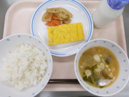献立 ご飯 みそ汁 キャベツの玉子焼き れんこんの金平 牛乳