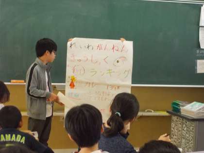 今日は、食材を生かしたシンプルな献立でした。れんこんの金平は、唐辛子を入れて味にアクセントをつけました。食欲が増してよく食べていました。給食委員会では、宮前小学校給食ランキングを調査し、まとめました。給食時間に各クラスに行って発表を行います。
