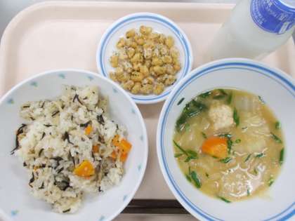 献立 切り干し大根ご飯 白菜と鶏団子汁 のりしお大豆 牛乳