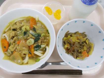 献立 カレーうどん さつま芋の金平 サイダーゼリー 牛乳