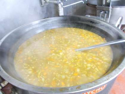 今日は3年1組のリクエスト献立でした。カレーうどんは人気があります。カレー粉を入れるタイミングを数回に分けて作ります。1年生は、少し辛みを抑えて作りました。