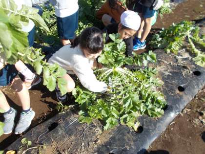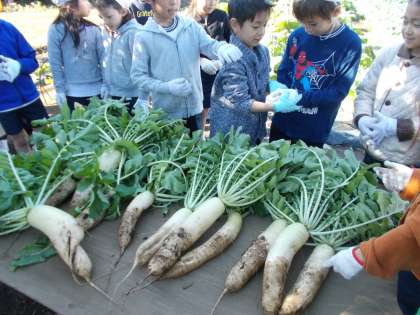 近隣の畑に2年生が大根を収穫しました。いつもの年より小ぶりの大根でしたが、大きな台風を乗り越えたので良かったです。今年は、台風の影響があったのか大根がまっすぐ育っていないものがたくさんありましたが、ななめに抜くやり方を聞いて一本もおらず収穫できました。大根を収穫するとみんな満足した顔でたくさんの笑顔が見られました。