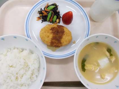 献立 ごはん みそ汁 里芋と豆腐のコロッケ 大豆とひじきの煮物 いちご 牛乳