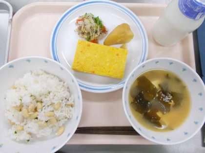 献立 大豆ごはん みそ汁 切り干し大根の玉子焼き 野菜のゆかり和え じゃが芋の甘煮 牛乳