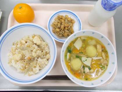 献立 びりんめし せんだご汁 大豆とじゃこのカリカリ揚げ 晴れ姫 牛乳