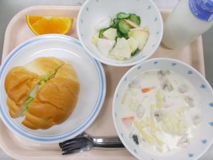 献立 ロールサンド マカロニのクリームスープ かぶとりんごのサラダ 紅マドンナ 牛乳