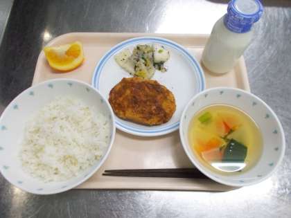 献立 ごはん すまし汁 豆入りコロッケ 野菜のゆかり和え いよかん 牛乳
