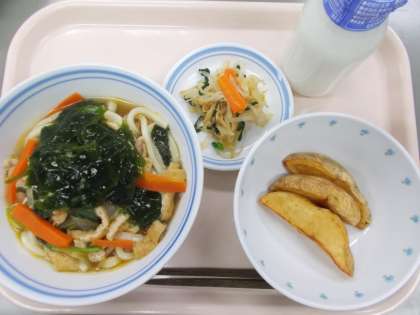 献立 わかめうどん 茹で野菜のにんにくじょうゆがけ カントリーポテト 牛乳